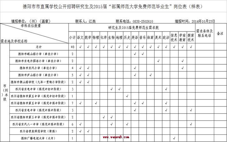 德陽市市直屬學校公開招聘研究生及2015屆“部屬師范大學免費師范畢業(yè)生”崗位表(樣表).rar