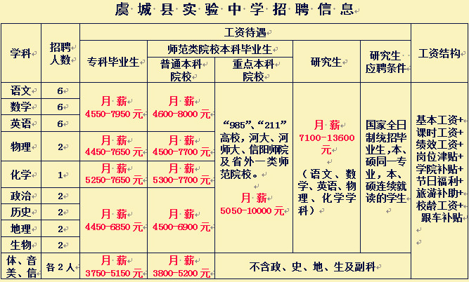 商?hào)|外國語實(shí)驗(yàn)學(xué)校、虞城縣實(shí)驗(yàn)中學(xué)、虞城縣春來小學(xué)舉辦招聘活動(dòng),誠聘優(yōu)秀教師,現(xiàn)將有關(guān)事宜公示如下: