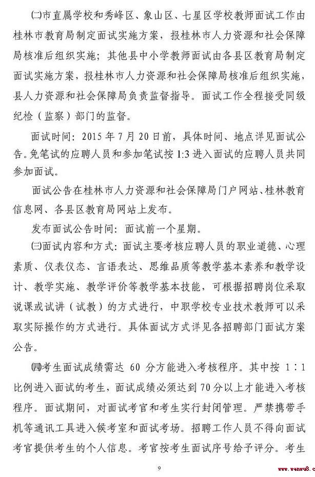 | 9 | 發(fā)布面試公告 | 面試前一星期 | 桂林市及各縣區(qū)教育局、人力資源和社會(huì)保障局 |
