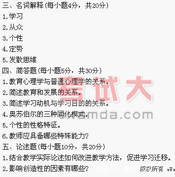 1.答:普通心理學(xué)是探討人的一般心理現(xiàn)象,即認(rèn)知過程、情感與意志活動及個性形成的規(guī)律,這些現(xiàn)象是所有的人都具有的;而教育心理學(xué)所探討的是學(xué)校中師生,主要是學(xué)生在教育過程中所出現(xiàn)的特有的學(xué)習(xí)心理、品格形成的心理及規(guī)律。兩者都研究心理現(xiàn)象,因此是相通的。