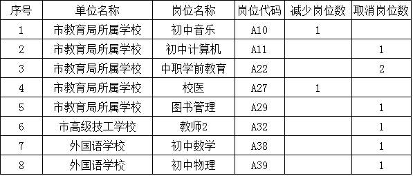 市教育局所屬學校取消和減少的崗位分別調(diào)劑至初中英語1個、初中生物1個、小學語文1個、小學英語1個。