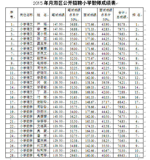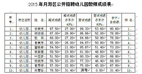 根據(jù)江西省《關(guān)于做好全省中小學(xué)教師招聘面試工作的通知》和《2015年月湖區(qū)教師招聘面試方案》,經(jīng)過筆試、面試,現(xiàn)將月湖區(qū)公開招聘教師筆試、面試成績公示如下: