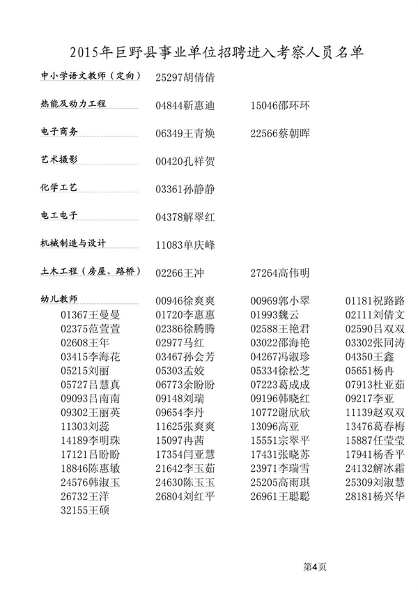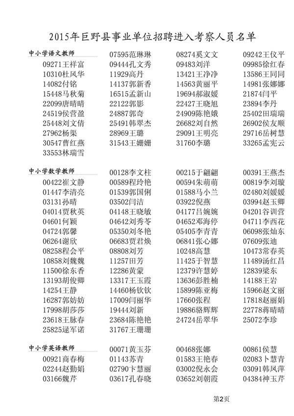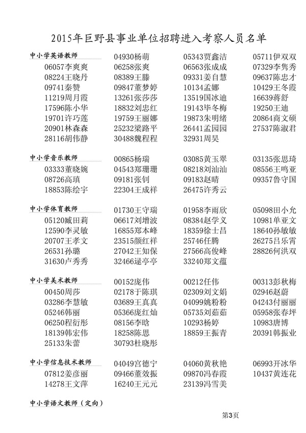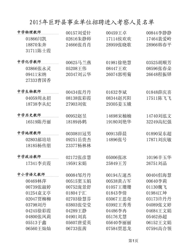 附:1、2015年巨野縣事業(yè)單位招聘進入擬考察人員名單
