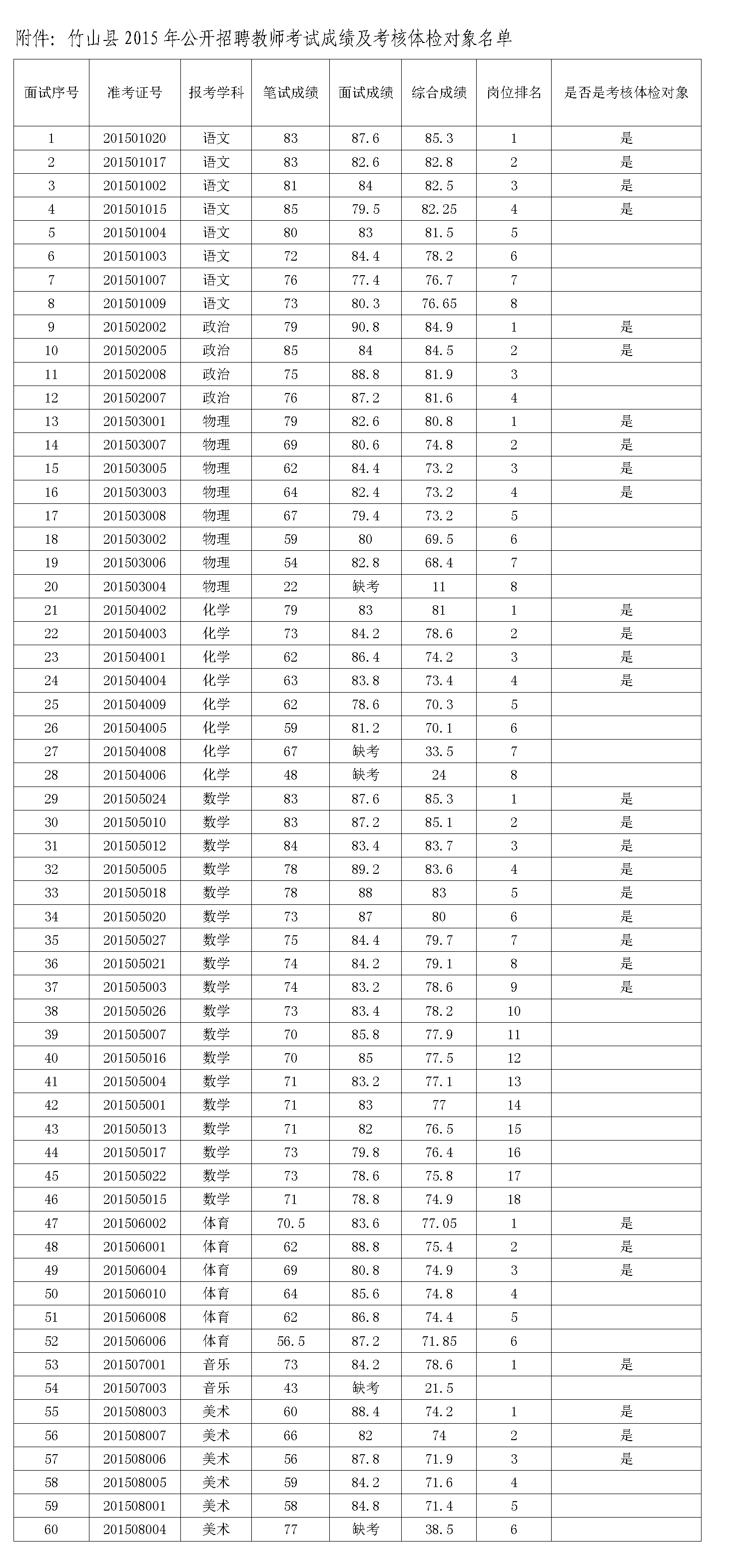 竹山縣2015年公開招聘初中教師考試成績(jī)及考核體檢公告