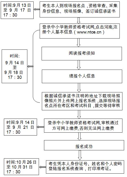 9月14日至21日17:30,考生登錄中小學(xué)教師資格考試網(wǎng)(www.ntce.cn),確認(rèn)通過網(wǎng)上報名審核后,即可按照提示進行網(wǎng)上繳費(網(wǎng)上支付流程圖見附件三),繳費完成后即為報名成功(考生報名流程圖見附件四)。