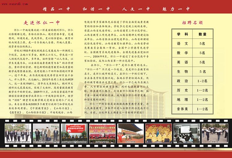 懷仁一中2015年招聘教師啟事 懷仁一中繼續(xù)面向全國(guó)六所免費(fèi)師范類(lèi)院校招聘優(yōu)秀教師,有意向者請(qǐng)撥打招聘簡(jiǎn)章上的電話咨詢或者發(fā)送簡(jiǎn)歷到電子郵箱。