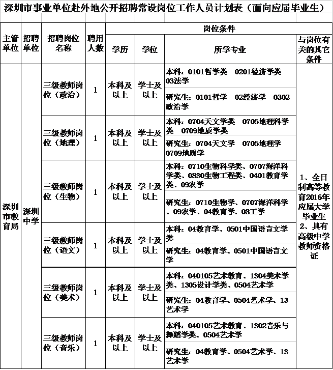 1.全日制普通高等院校2016年應(yīng)屆大學(xué)畢業(yè)生符合本崗位的要求(具體崗位及專業(yè)要求請參見附件《深圳市事業(yè)單位赴外地公開招聘常設(shè)崗位工作人員計劃表(面向應(yīng)屆畢業(yè)生)》)。報考者的專業(yè)名稱必須符合計劃表中相關(guān)崗位的專業(yè)名稱。