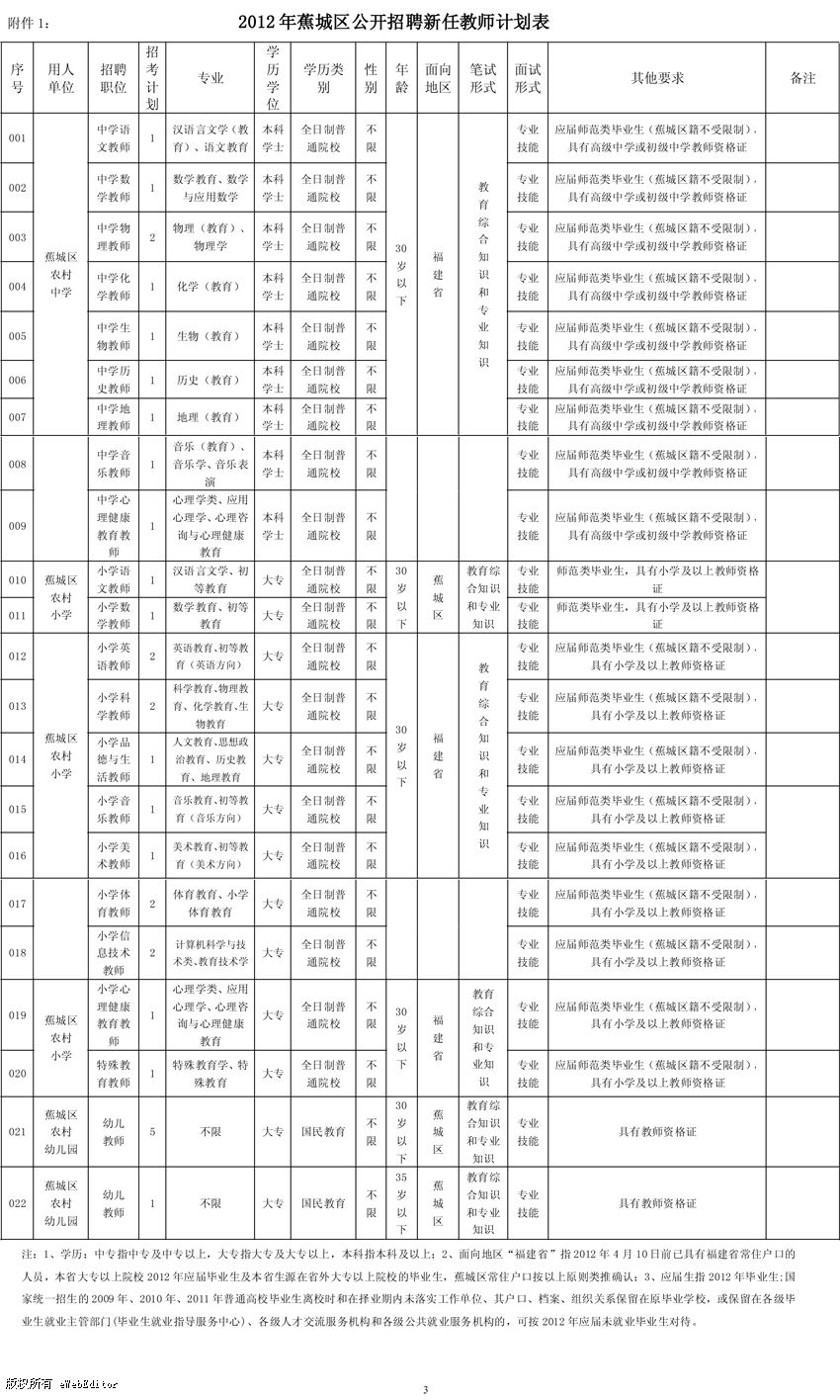 附件:1、2012年蕉城區(qū)公開招聘新任教師計劃表