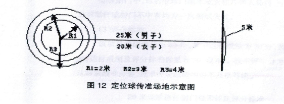 ①以0為圓心,以2米、3米、4米分別為半徑,畫出3個不同半徑的同心圓。圓心處插上一根0.5米高并系有彩色小旗的標(biāo)志桿,作為傳準(zhǔn)目標(biāo)。