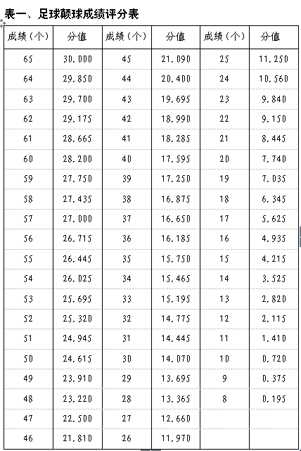 考生若按要求連續(xù)顛球65個,可得滿分。成績及評分標(biāo)準(zhǔn)詳見表一