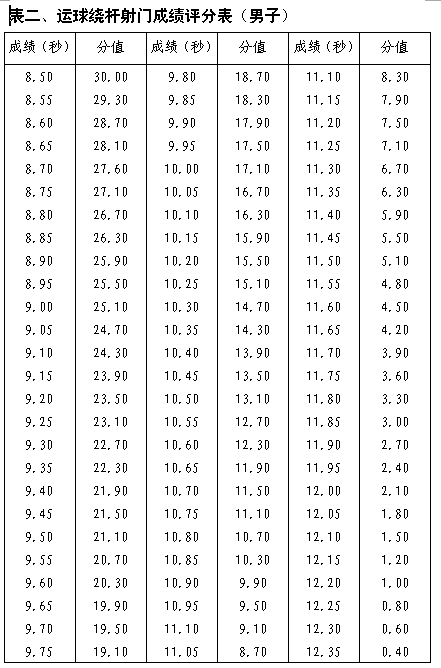該項(xiàng)目成績滿分為30分,達(dá)標(biāo)成績及評分標(biāo)準(zhǔn)詳見表二、表三。