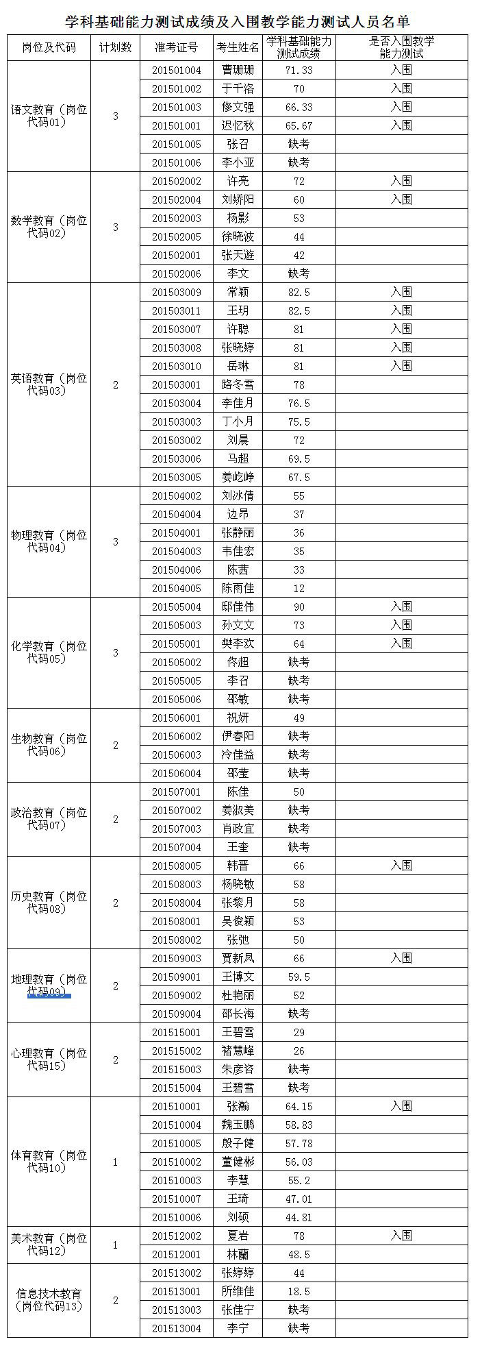 一、學(xué)科基礎(chǔ)能力測試成績及入圍教學(xué)能力測試人員名單