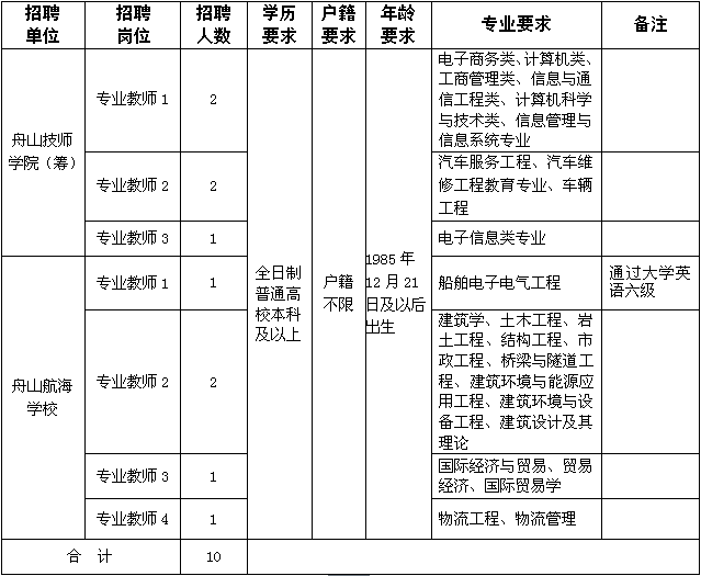 為加快推進(jìn)職業(yè)教育建設(shè),服務(wù)舟山群島新區(qū),按照《浙江省事業(yè)單位公開招聘人員暫行辦法》要求,經(jīng)舟山市人力資源和社會保障局同意,舟山技師學(xué)院(籌)和舟山航海學(xué)校決定面向社會公開招聘10名專業(yè)教師,現(xiàn)將有關(guān)事項(xiàng)公告如下: