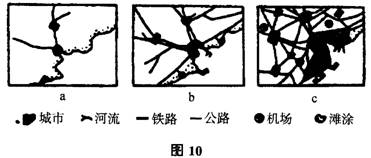 (2)在城市化進(jìn)程中,a圖的交通工具依賴于_________;b圖的交通工具依賴于________;c圖的交通工具依賴于_______,交通線的特點(diǎn)是_____。(6分)