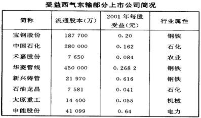 (2)新興鑄管 申能 西氣東輸工程需要大量的管道,故新興鑄管股份(鋼鐵)升高,工程建成后發(fā)電成本將降低,國(guó)家投資對(duì)申能股份(電力)具有促進(jìn)作用,故其股份升高較多。