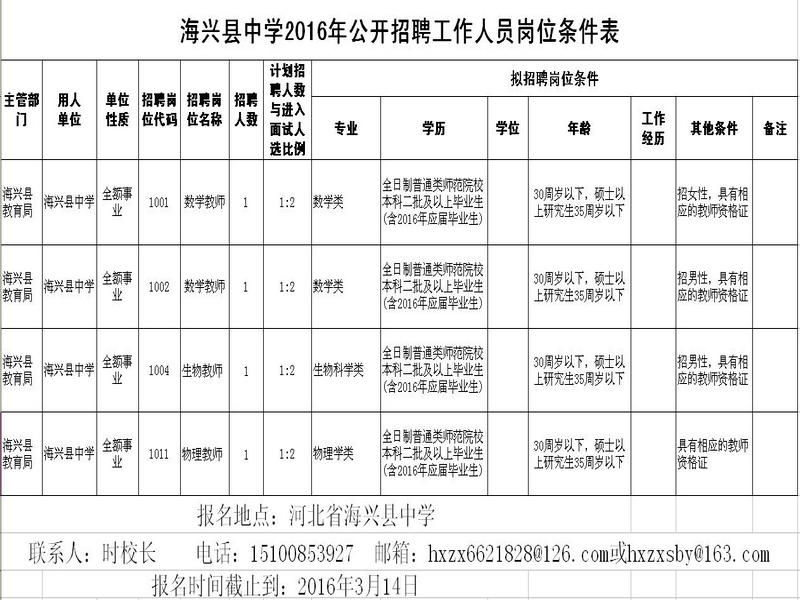 | 海興縣中學(xué)2016年公開招聘工作人員崗位條件表