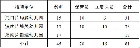 為了促進(jìn)開發(fā)區(qū)(漢南區(qū))學(xué)前教育科學(xué)持續(xù)發(fā)展,深入推進(jìn)第二期學(xué)前教育三年行動(dòng)計(jì)劃實(shí)施,根據(jù)《教育部關(guān)于印發(fā)<幼兒園教職工配備標(biāo)準(zhǔn)(暫行)>》(教師〔2013〕1號(hào))、《武漢市學(xué)前教育管理辦法》(市政府令第253號(hào))等文件精神,結(jié)合本區(qū)實(shí)際,擬采取聘用制方式,面向社會(huì)公開招聘幼兒園教職工81名,其中專任教師45名、保育員20名、工勤人員16名。為確保招聘工作平穩(wěn)有序進(jìn)行,特制定本方案。