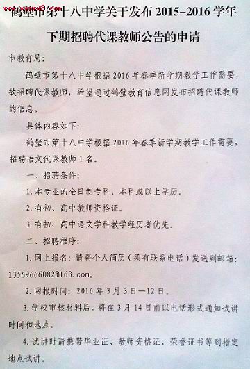 河南省鶴壁市第十八中學2016年教師招聘公告