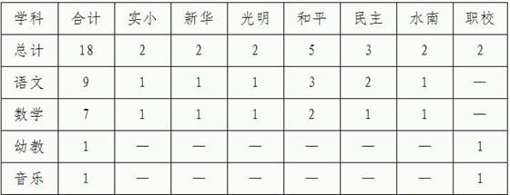 選調(diào)名額18名,其中實(shí)驗(yàn)小學(xué)2名、新華小學(xué)2名、光明中心小學(xué)2名、和平小學(xué)5名、民主小學(xué)3名、水南中心小學(xué)2名、職業(yè)技術(shù)學(xué)校2名。選調(diào)學(xué)科及崗位詳見(jiàn)下表。