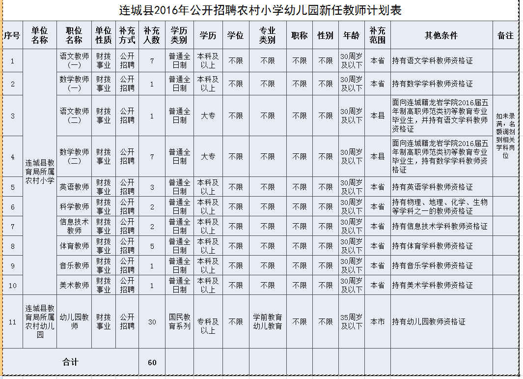 福建省福州市連城縣教育局2016年農(nóng)村小學(xué)幼兒園新任教師招聘通告(60名) [薦]