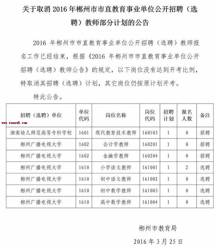 2016年湖南省郴州市教師招聘部分崗位取消計劃的公告
