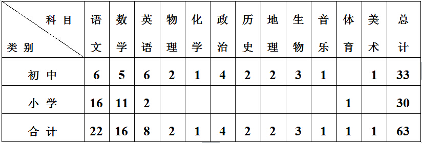 本次擬公開招聘教師共63名:初中33名,小學(xué)30名。具體學(xué)科計(jì)劃如下: