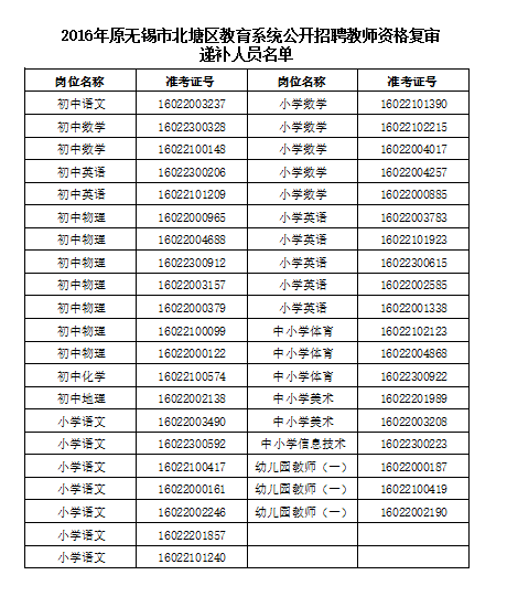 2016年原無錫市北塘區(qū)教育系統(tǒng)公開招聘教師資格復審人員遞補公告(一)