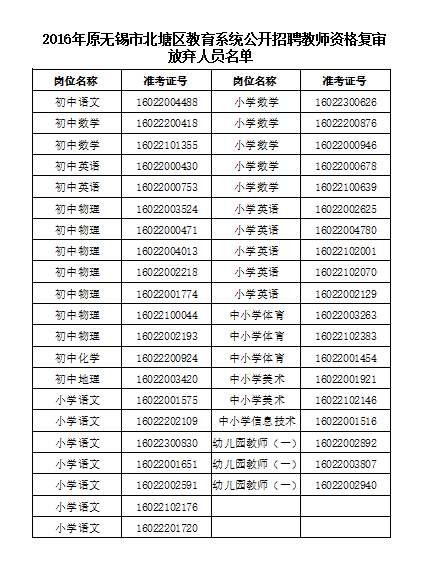 因考生個人原因,部分考生自愿放棄2016年原無錫市北塘區(qū)教育系統(tǒng)公開招聘教師資格復審,名單詳見附件1。