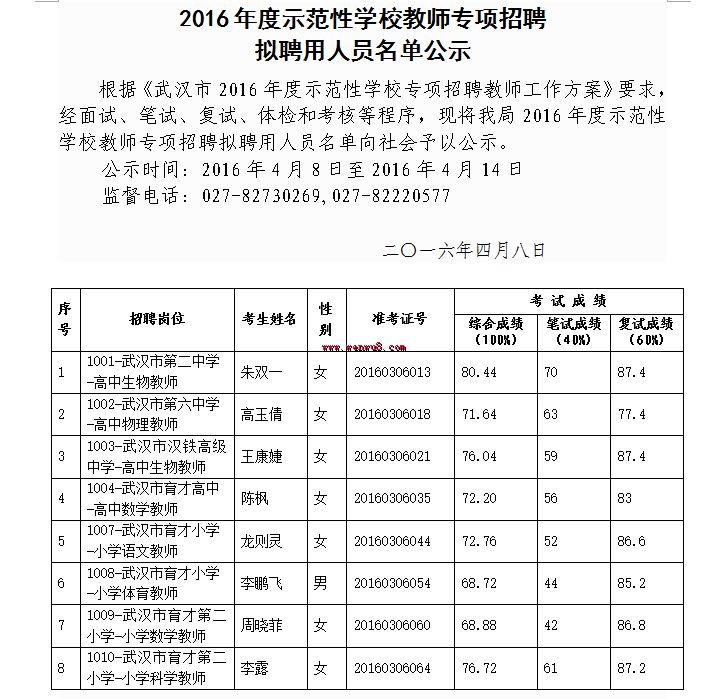 湖北省武漢市江岸區(qū)2016年度示范性學(xué)校教師招聘擬聘用人員名單公示