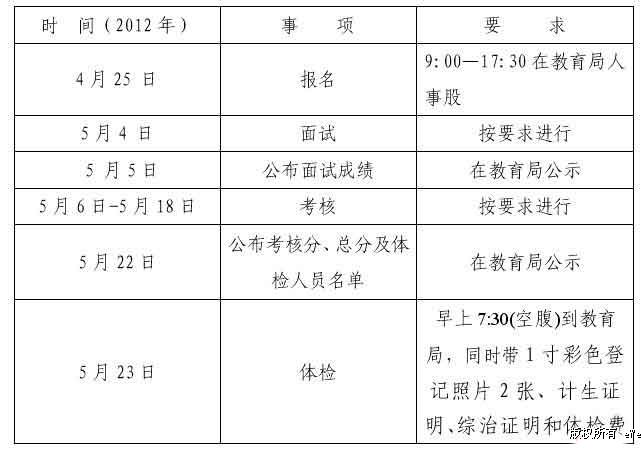 2、報(bào)名時(shí)間、地點(diǎn):2012年4 月 25日9:00——17:30到利川市教育局人事股報(bào)名。