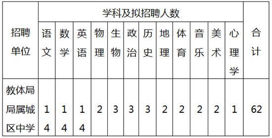 擬招聘項城市教體局局屬城區(qū)中學(xué)教師62名,均為專業(yè)技術(shù)十二級及以下崗位,各崗位招聘人數(shù)如下: