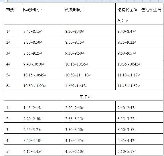 考生面試流程:考生簽到(上午7:30、下午13:30),通訊工具關(guān)閉后,把需保存的物品放在侯考室指定位置;工作人員宣讀考生規(guī)則!忌楹灢⒑灻_認(rèn)(上午7:35、下午13:35考生進(jìn)行抽簽;7:45、13:45后到達(dá)候考室的視為放棄面試)——候考——閱題(上午第一位考生于7:45開始閱題,下午第一位考生于13:45開始閱題)——面試(每位考生面試1節(jié)課)——候分——領(lǐng)取考生面試成績通知書及隨身物品——離開考場。