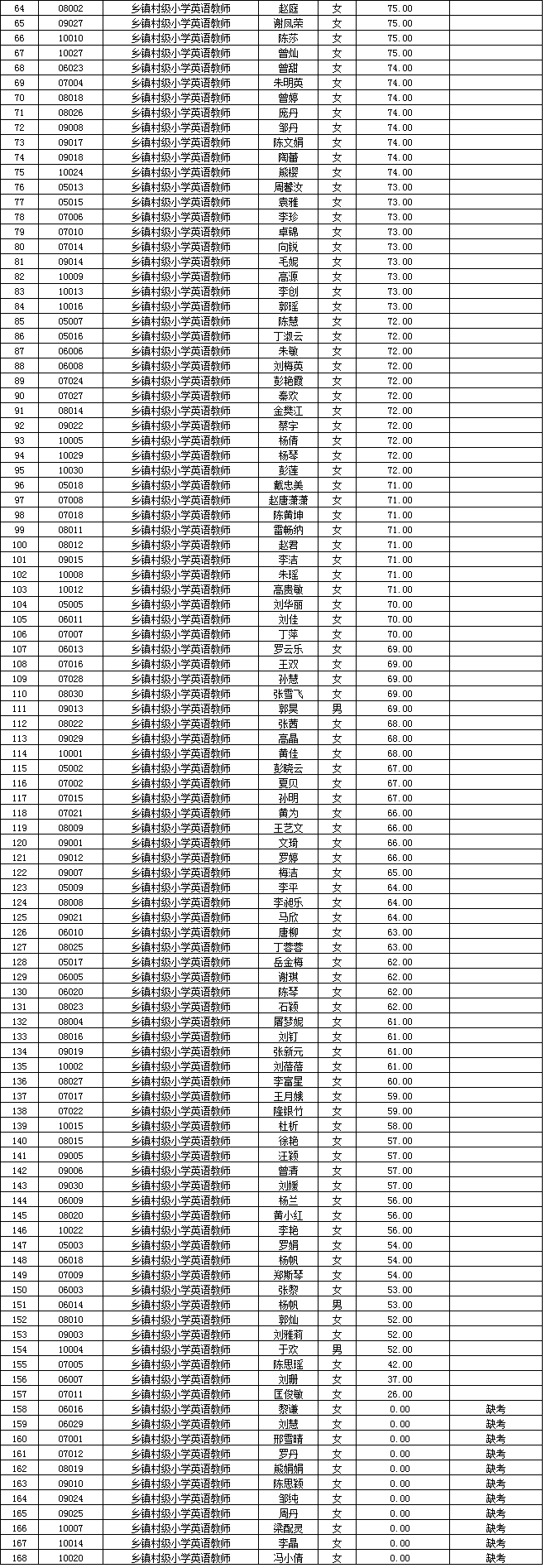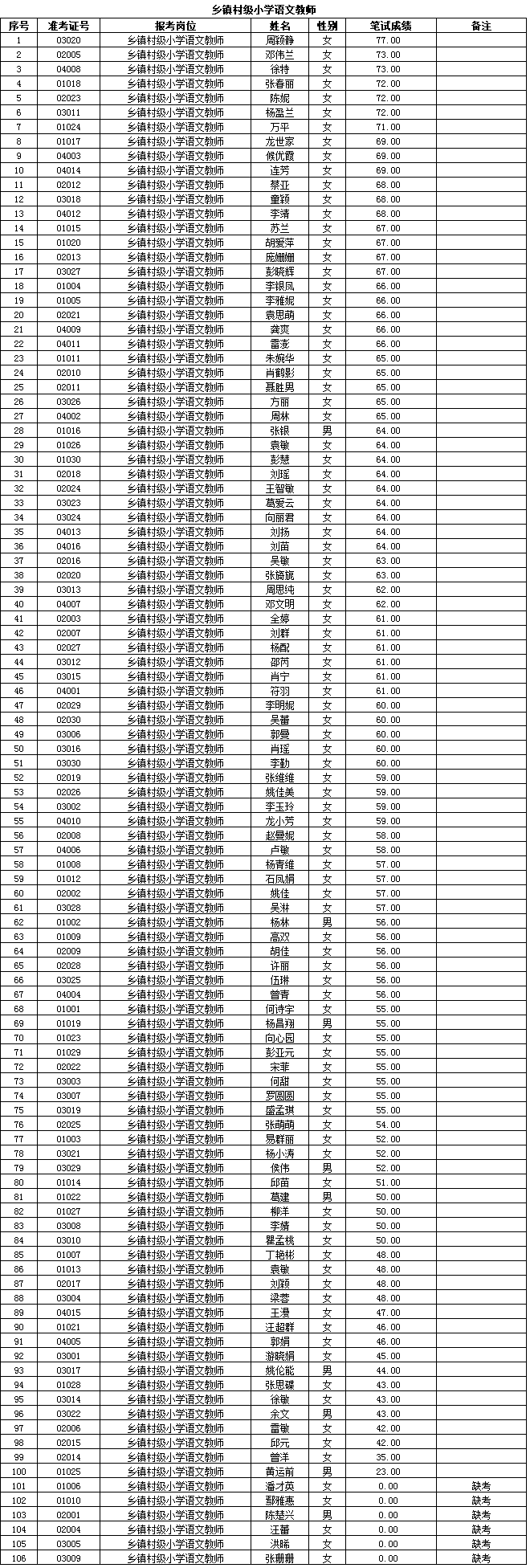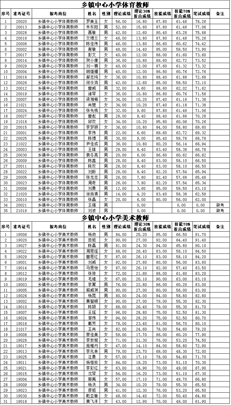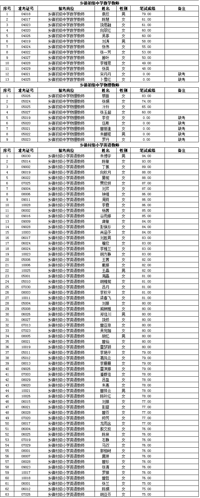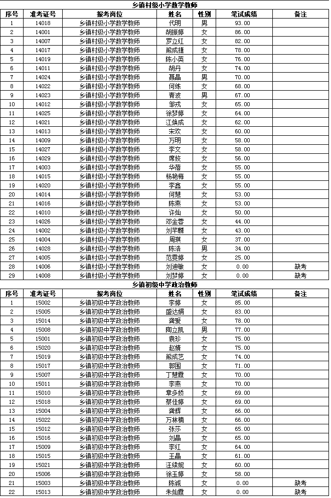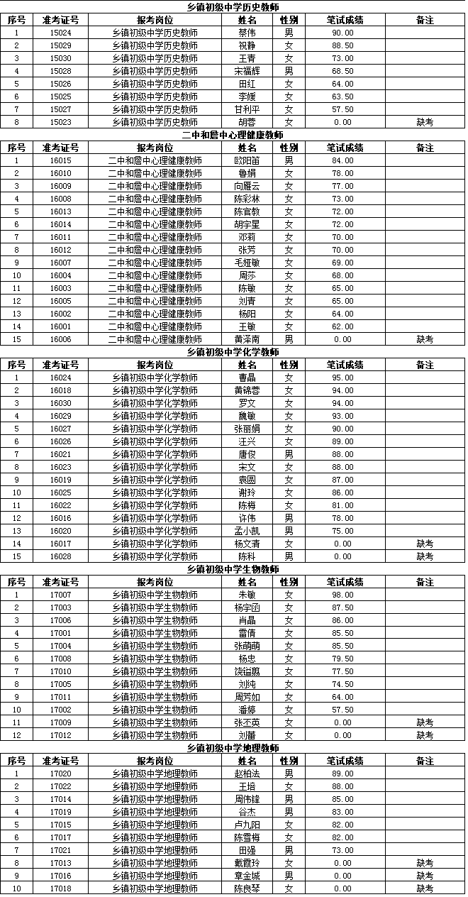 漢壽縣2016年第二批公開招聘教師考試筆試成績公示