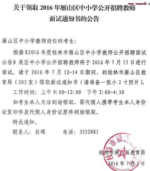 關(guān)于領(lǐng)取2016年雁山區(qū)中小學(xué)公開招聘教師面試通知書的公告(6月30日)