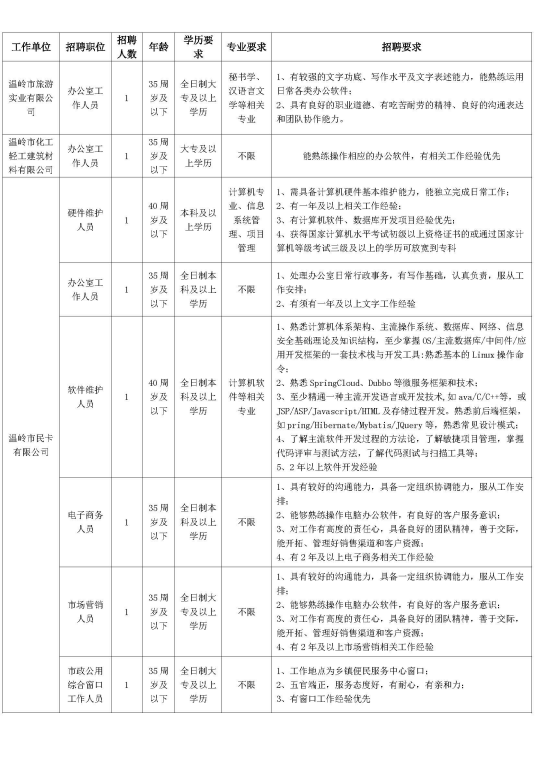 溫嶺市交通旅游集團有限公司為溫嶺市政府直屬國有企業(yè),是一家主要承擔我市域交通工程、道路運輸服務、旅游、保安服務、教育、文化、衛(wèi)生、體育等領域及相關項目融資、建設、運營的綜合性集團。目前,集團現(xiàn)有總資產(chǎn)約240億元,一級子公司15個。因發(fā)展需要,集團擬面向社會公開招聘編外工作人員,現(xiàn)將有關事項公告如下: