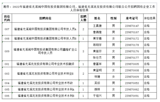 附件:2022年福建省尤溪閩中國有投資集團有限公司、福建省尤溪沈發(fā)投資有限公司聯(lián)合公開招聘國有企業(yè)工作人員體檢結果
