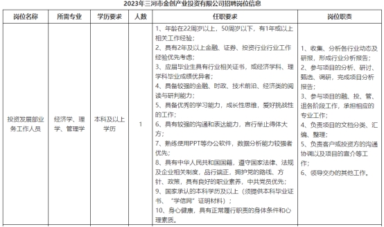 三河市金創(chuàng)產(chǎn)業(yè)投資有限公司成立于2016年5月,為三河市政府直接管理的市屬國有企業(yè)。主營業(yè)務(wù)為三河市產(chǎn)業(yè)引導(dǎo)基金及其他投資、金融、項(xiàng)目管理等服務(wù)。公司除產(chǎn)業(yè)引導(dǎo)基金業(yè)務(wù)以外,下屬兩家子公司,分別為三河市中小企業(yè)融資擔(dān)保有限公司和三河市惠企金融信息服務(wù)有限公司。現(xiàn)因業(yè)務(wù)發(fā)展需要,特面向社會公開招聘投資發(fā)展部業(yè)務(wù)工作人員1名、風(fēng)控法務(wù)工作人員1名,現(xiàn)將相關(guān)事宜公告如下: