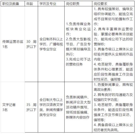 左權(quán)縣開(kāi)花調(diào)文化發(fā)展有限公司成立于2021年11月,屬?lài)?guó)有獨(dú)資企業(yè),是一家專(zhuān)注于現(xiàn)代傳媒領(lǐng)域,致力于特色文化傳承的新興企業(yè)。業(yè)務(wù)涉及文化演藝、廣告?zhèn)髅健⒔逃嘤?xùn)和新媒體四大板塊。因傳媒業(yè)務(wù)發(fā)展需要,現(xiàn)面向社會(huì)公開(kāi)招聘工作人員4名,現(xiàn)將有關(guān)事項(xiàng)公告如下: