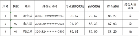 根據(jù)《江蘇常州市曲藝團招聘企業(yè)用工簡章》要求,現(xiàn)考生報名、資格審核、專業(yè)測試、面試環(huán)節(jié)已結(jié)束。根據(jù)考生的綜合成績,按照招聘崗位計劃1︰1的比例從高分到低分依次確定參加體檢人選。現(xiàn)將綜合成績及入圍體檢名單予以公布,詳見下表: