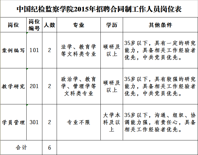 此次計(jì)劃招聘工作人員6名,具體見(jiàn)《中國(guó)紀(jì)檢監(jiān)察學(xué)院2015年招聘合同制工作人員崗位表》。