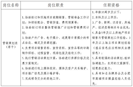 根據(jù)業(yè)務(wù)需要,合肥市人力資源服務(wù)有限公司現(xiàn)對外招聘若干名地產(chǎn)項目營銷策劃崗人員派駐至合肥市軌道交通集團下屬子公司工作,F(xiàn)將有關(guān)事項公告如下: