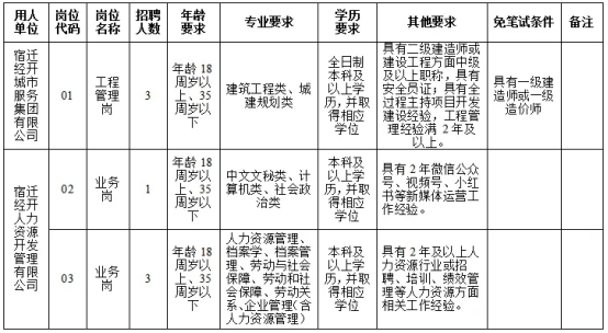 弘業(yè)集團下屬子公司宿遷經開城市服務集團有限公司、宿遷經開人力資源開發(fā)管理有限公司因業(yè)務發(fā)展需要,面向社會公開招聘7名工作人員,特制定簡章如下: