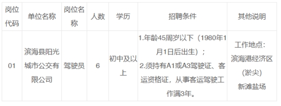 5.具備《2025年濱海縣陽光城市公交有限公司公開招聘人員崗位表》中崗位要求的資格條件。