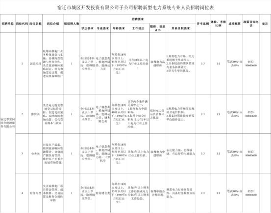 招聘單位和招聘崗位及相關(guān)要求等內(nèi)容,詳見附件《宿遷市城區(qū)開發(fā)投資有限公司子公司招聘新型電力系統(tǒng)專業(yè)人員招聘崗位表》(以下簡(jiǎn)稱《崗位表》)。
