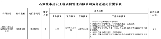 根據(jù)工作需要,石家莊市建設(shè)工程項(xiàng)目管理有限公司特委托石家莊市國(guó)經(jīng)人力資源管理有限公司面向社會(huì)公開(kāi)招聘勞務(wù)派遣制人員1名,F(xiàn)將具體招聘流程設(shè)定如下: