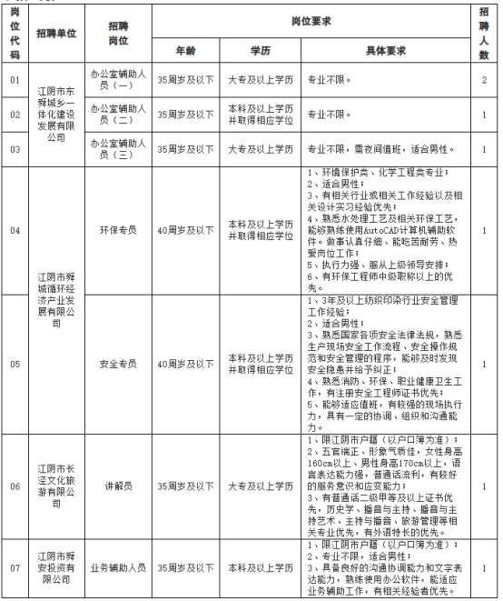 因業(yè)務(wù)需要,江陰市長涇鎮(zhèn)國資公司決定面向社會公開招聘工作人員8名,F(xiàn)將有關(guān)事項公告如下: