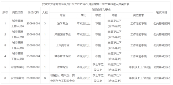因工作需要,蕪湖市人才發(fā)展集團(tuán)受安徽大龍灣開發(fā)有限責(zé)任公司委托,面向社會開展勞務(wù)派遣人員公開招聘,F(xiàn)將有關(guān)事項(xiàng)公告如下: