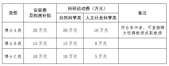 根據(jù)引進(jìn)博士的類型和層次的不同,分別對(duì)應(yīng)下表享受有關(guān)待遇: