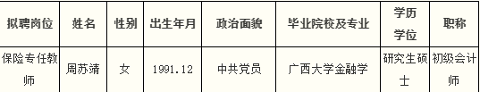 根據(jù)《關(guān)于印發(fā)<廣西壯族自治區(qū)事業(yè)單位公開招聘人員實(shí)施辦法>的通知》(桂人社發(fā)[2011]155號(hào))及《廣西金融職業(yè)技術(shù)學(xué)院2021年第一批公開招聘非實(shí)名人員控制數(shù)工作人員公告》的有關(guān)規(guī)定,通過報(bào)名、資格審查、考試、考核、體檢等程序,經(jīng)研究決定,擬聘周蘇靖同志為我院工作人員,F(xiàn)將擬聘用人員名單予以公示,公示時(shí)間為2022年3月7日-2022年3月15日,如有異議,請于2022年3月15日下午5:00前以書面形式并署真實(shí)姓名反饋到學(xué)院紀(jì)委或組織人事處。聯(lián)系地址:廣西南寧市大學(xué)西路168號(hào),郵政編碼:530007,聯(lián)系電話:0771—3481676,0771—3481779。