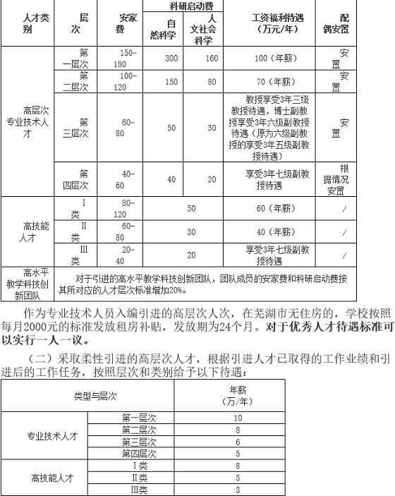 高層次人才引進(jìn)采取入編引進(jìn)和柔性引進(jìn)兩類(lèi)。對(duì)于教學(xué)科研崗位全職引進(jìn)的高層次人才,學(xué)校按照《安徽商貿(mào)職業(yè)技術(shù)學(xué)院關(guān)于印發(fā)<高層次人才引進(jìn)與管理暫行辦法>的通知》(商職院字〔2020〕159號(hào))提供安家費(fèi)、科研啟動(dòng)經(jīng)費(fèi)等,標(biāo)準(zhǔn)如下(見(jiàn)表)(稅前,單位為人民幣,下同):